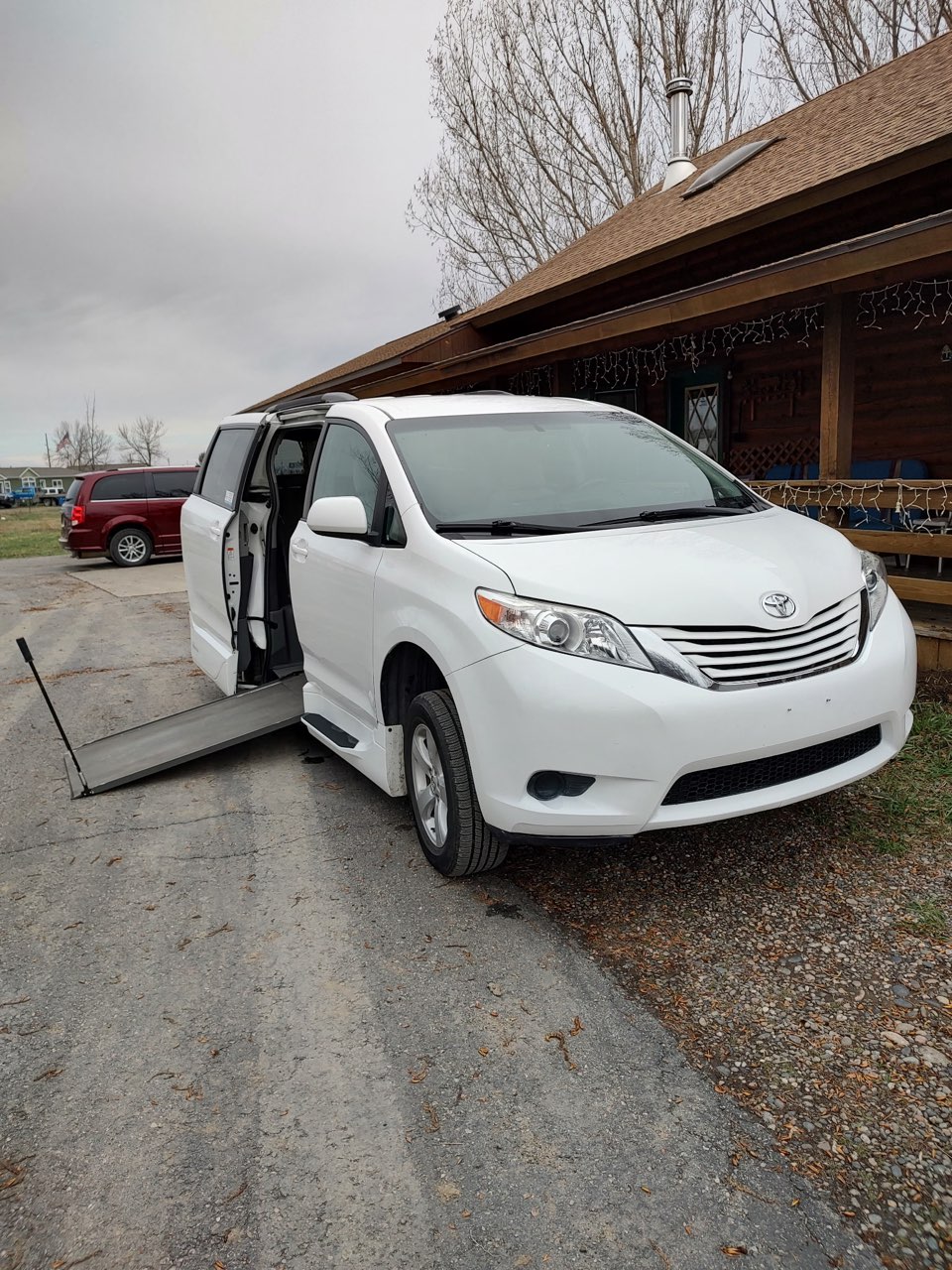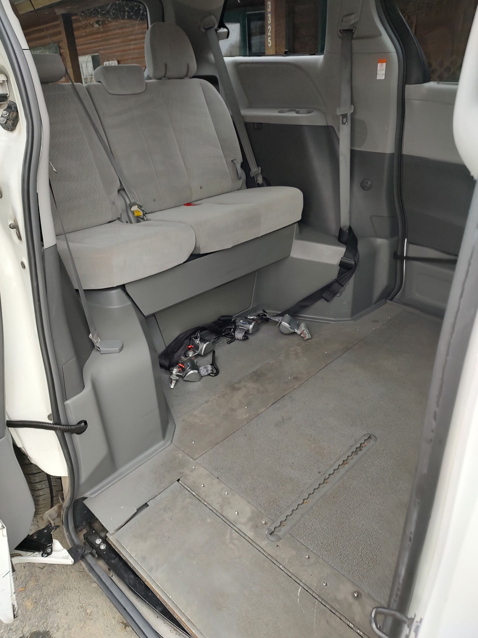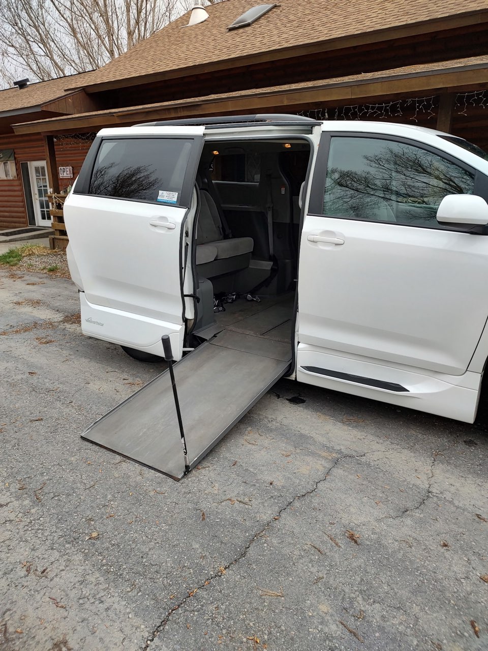 2017 Toyota Sienna with ADA conversion. 14 inch lowered floor, manual passenger slide door, manual ramp(ramp is pulled out with handle you see to the right of the ramp at the top. 4 retractable tie downs. Mileage 70,500.00. White in color. This is $38,500.00.